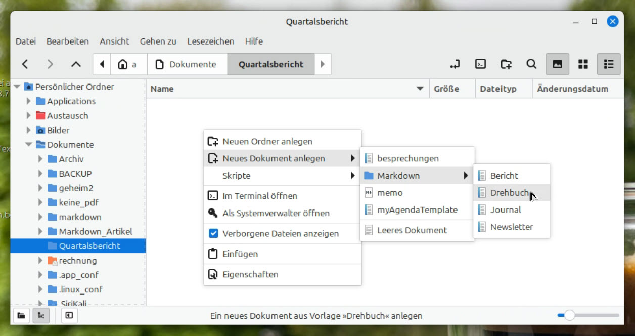 Unterschätzt werden von vielen Anwender die Möglichkeiten ihres Standard-Dateimanagers. Nemo & Co. haben ein Verzeichnis namens "Vorlagen". Kopiert man die Writer-Vorlagen in dieses Verzeichnis, so kann man mit einem Klick die passende Vorlage aufrufen, ohne diese aus dem Katalog aussuchen zu müssen: