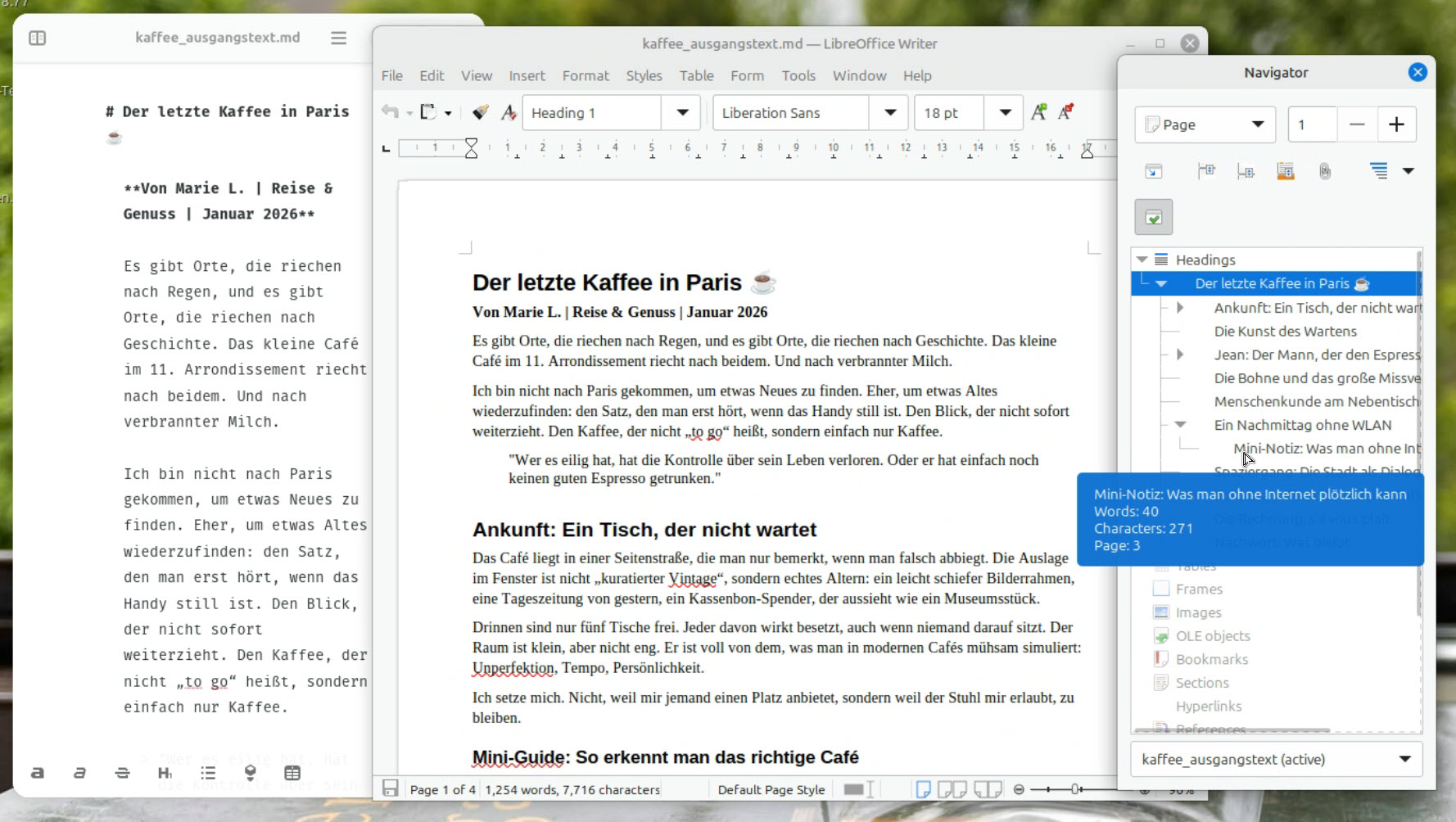 Öffnet man die Markdown-Datei direkt, so erhält man eine saubere Version in Writer, die Überschriften, Fotos, Zitate, Tabellen usw. korrekt übernimmt und darstellt. Die Überschriften-Gliederung der Markdown-Datei kann man sich im Writer-Navigator anzeigen lassen. Damit erhält man die üblichen Lesezeichen, so dass man direkt zu Abschnitten bei längeren Texten springen kann. Kleiner Hinweis am Rande: Wort- und Zeichenzahl werden inzwischen im Writer auch per Abschnitt angezeigt, nicht nur für das Gesamtdokument.