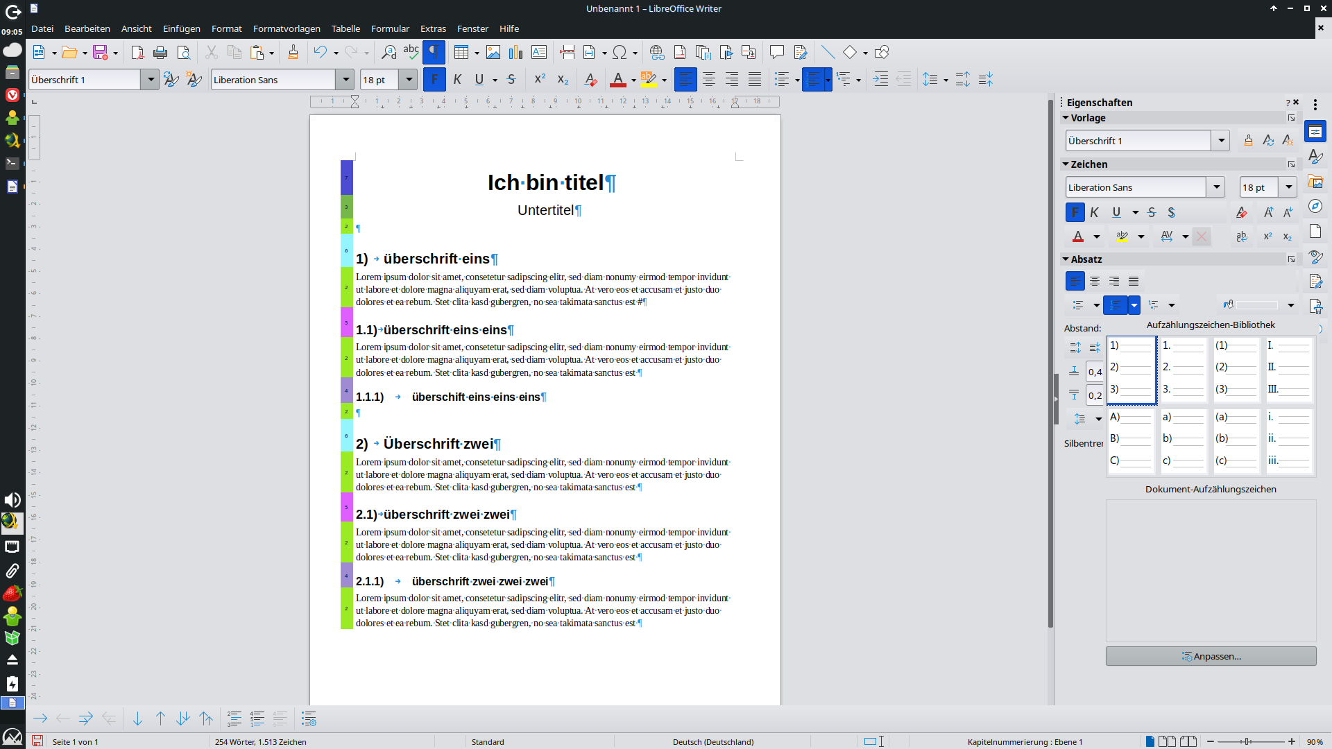 Hi, das ist lustig gerade erst vor ein paar Wochen in einem Kurs mich mit MS Word auseinandersetzen dürfen, und genau so etwas machen. Ja ist echt eine Leichtigkeit, und daraus ein Inhaltsverzeichnis zu erstellen. Aber ich hab’s nie in meinem LibreOffice versucht, das ich über ein Jahr nicht benutzt habe. Knapp 5 Minuten später sieht es so aus, hoffe Bild einfügen klappt einfach.