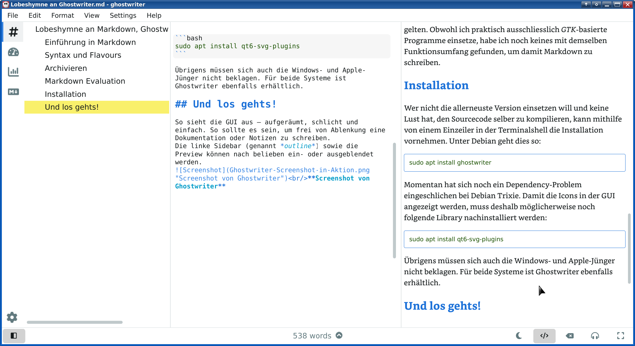 Ghostwriter ist in die "KDE Suite" aufgenommen worden. Dies gibt mir eine bestimmte Gewissheit, dass dieses Tool zumindest länger gepflegt wird als andere Markdown-Editoren. Solche gibt's mittlerweile wie Sand am Meer. Einfache, überladene, geforkte, absturzfreudige... Mark Text zum Beispiel wird leider nicht mehr weiter entwickelt. Dabei hätte es sich neben Typora als Opensource Alternative gut sehen lassen können.