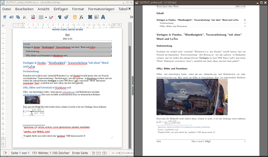 Der Versuch, auf einem antiken "Netbook" mit nur 1024 px Breite gleich zwei komplette – mit den obigen Vorlagen erzeugte – DIN-A4-Dokumente (zuzüglich GUI) darstellen zu wollen, ist natürlich zum Scheitern verurteilt, aber etwa folgendermaßen sieht eine noch "frühe" Version unseres Artikels gerendert aus (links als docx in Libreoffice, rechts 'mupdf'):
