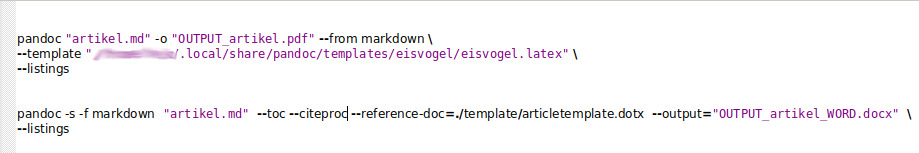 In unserem Beispiel wollen wir uns zunächst auf 'docx' ('odt' geht natürlich auch) und 'pdf' beschränken. Ferner könnte man aus dem erstellten Markdown – imPrinzip – auch 'tex' (für eine Weiterverwendung in LaTeX-Workflows), 'ebook' oder gar 'pptx' Folien basteln.