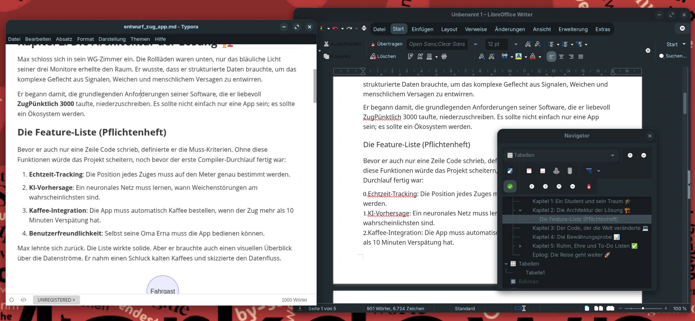 Ich habe den Vorgang mit einer Reihe komplexer Markdown-Dateien wiederholt - immer hatte ich ein sehr sauberes und ansprechendes Ergebnis. Zum Vergleich habe ich von meinem Standard-Markdown-Editor Typora einmal über die Zwischenablage die Vorschau in LibreWriter kopiert, was aber nicht vergleichbar gute Ergebnisse lieferte: