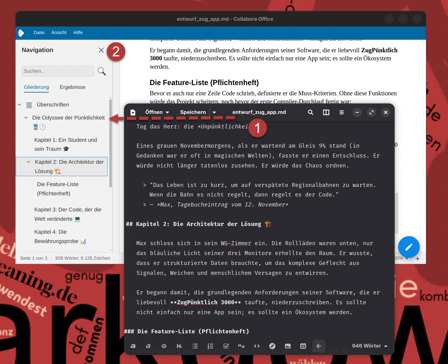 Im Screenshot sieht man den Markdown-Quelltext (1) im Editor Apostrophe [3], dahinter die Darstellung in Collabora (2). Markdown-Dateien werden in einem Vorschau-Modus von Collabora geöffnet. Erst wenn man das Stift-Icon rechts unten in der Ecke anklickt öffnet sich das eigentliche Bearbeitungsfenster: