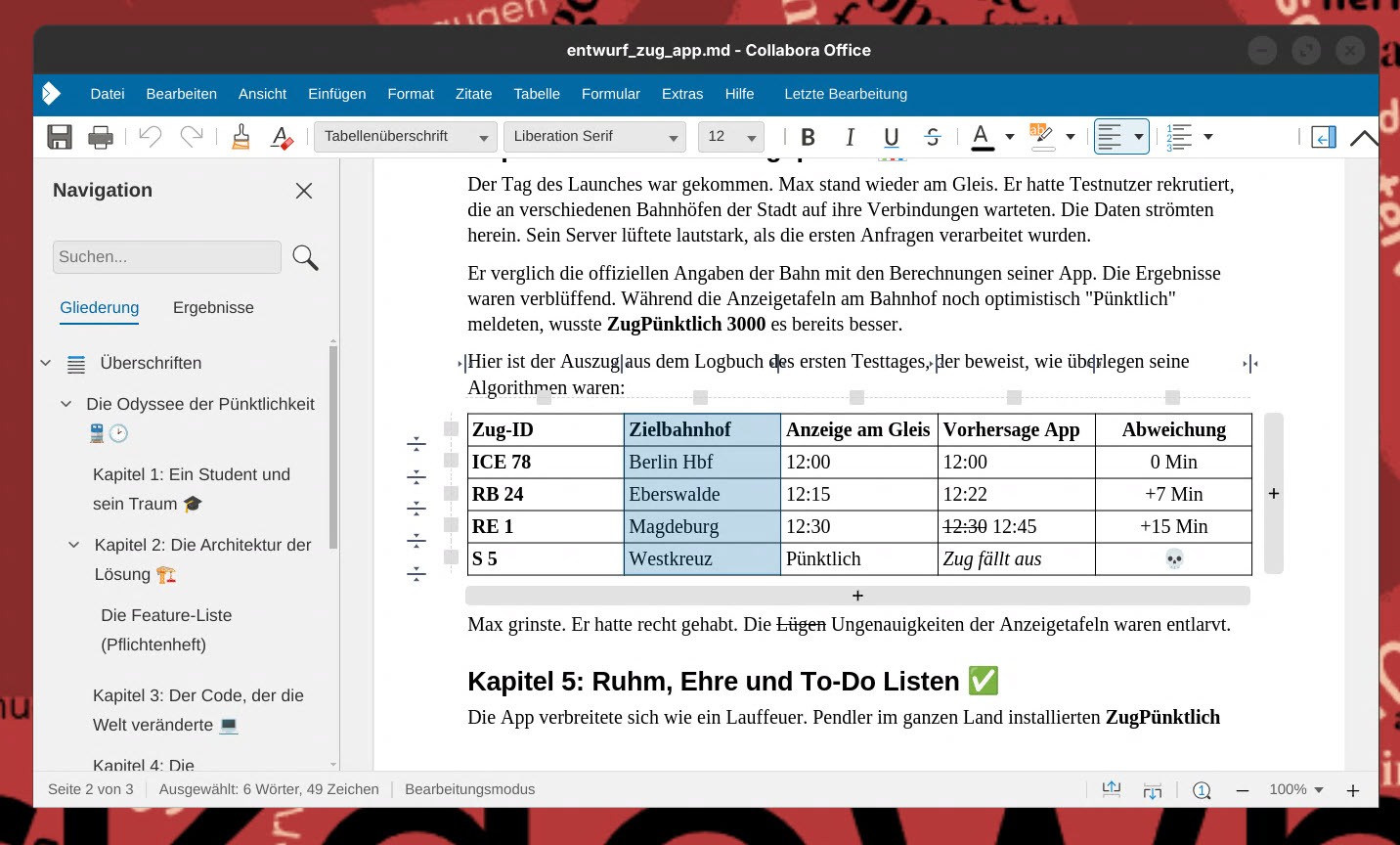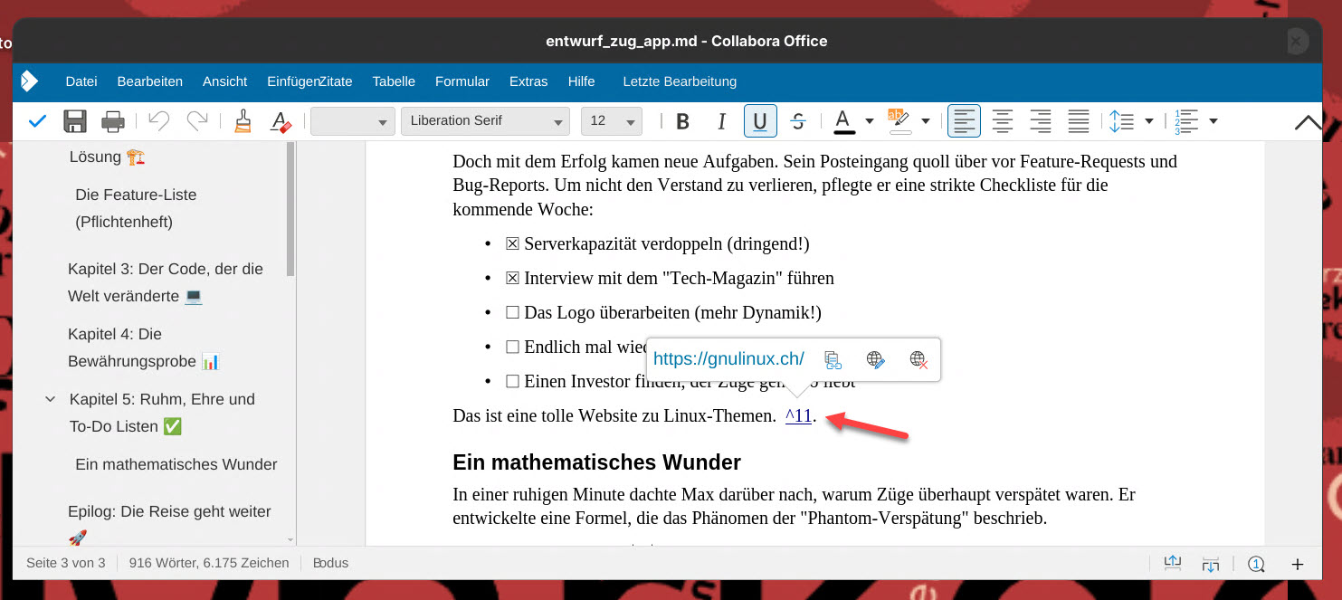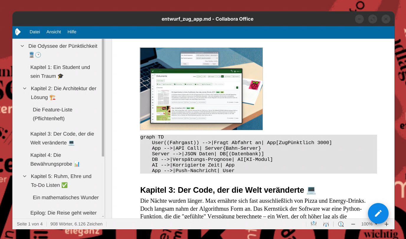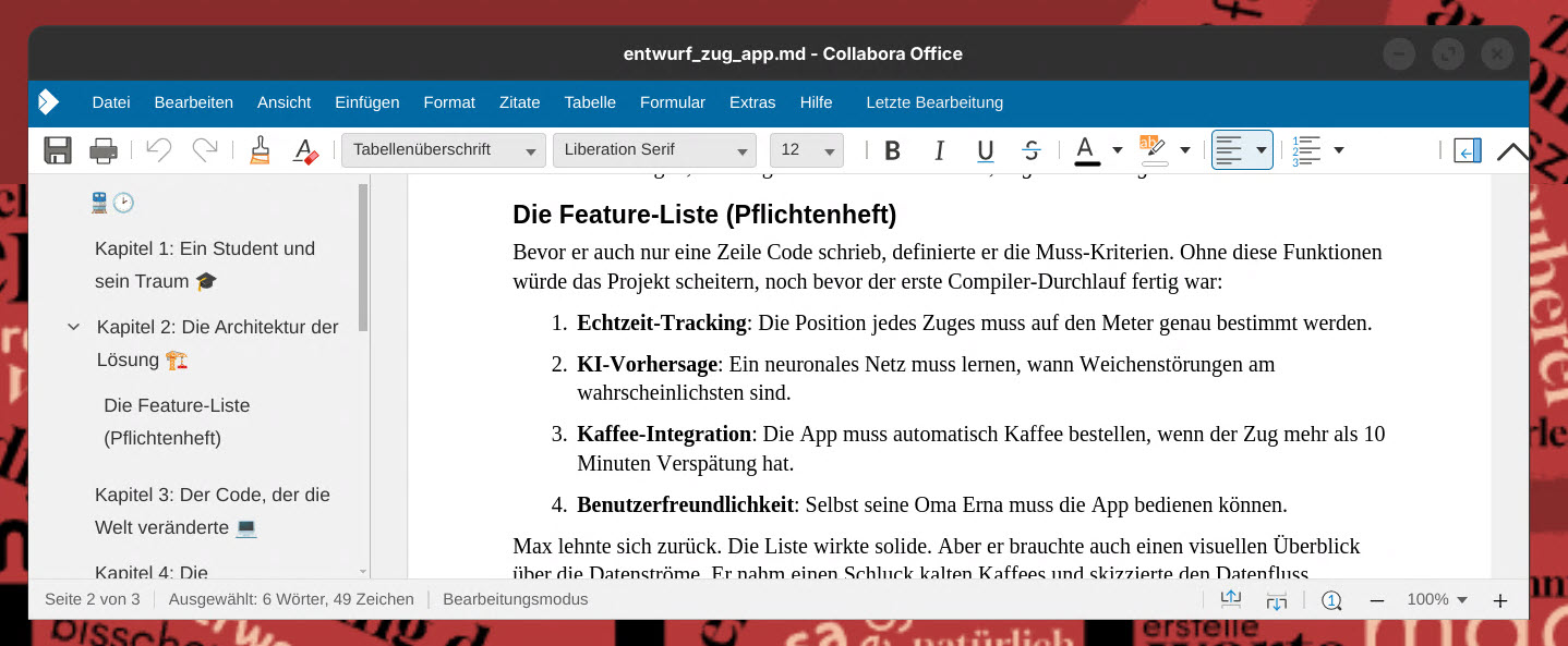 Die Interpretation der Markdown-Anweisungen ist gelungen. Man erhält ein sauber formatiertes Dokument, das man mit den Werkzeugen von Collabora bearbeiten und formatieren kann.