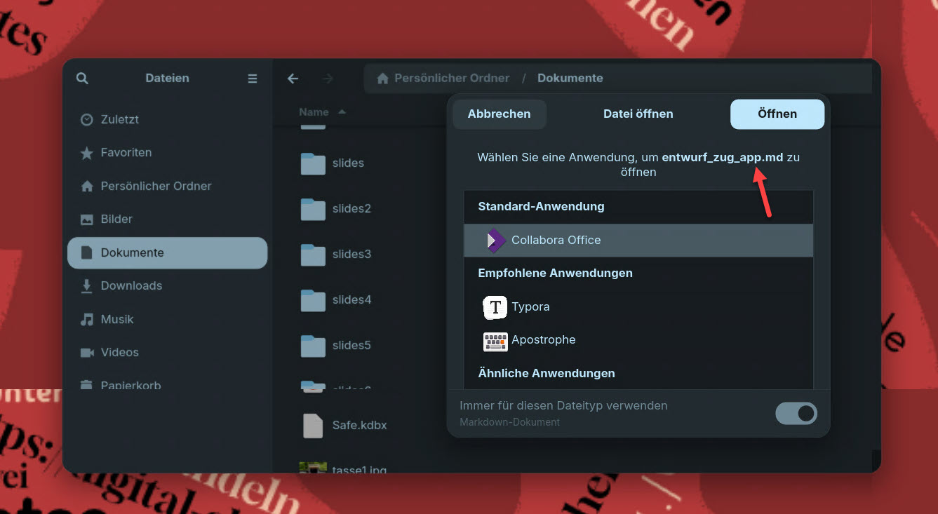 Zumindest der Import-Teil des Filters funktioniert bereits direkt nach der Installation in Collabora Desktop 25.03.7.2. Markdown-Dateien können direkt über das Kontextmenü der Dateimanager ausgewählt werden und werden formatiert eingeblendet: