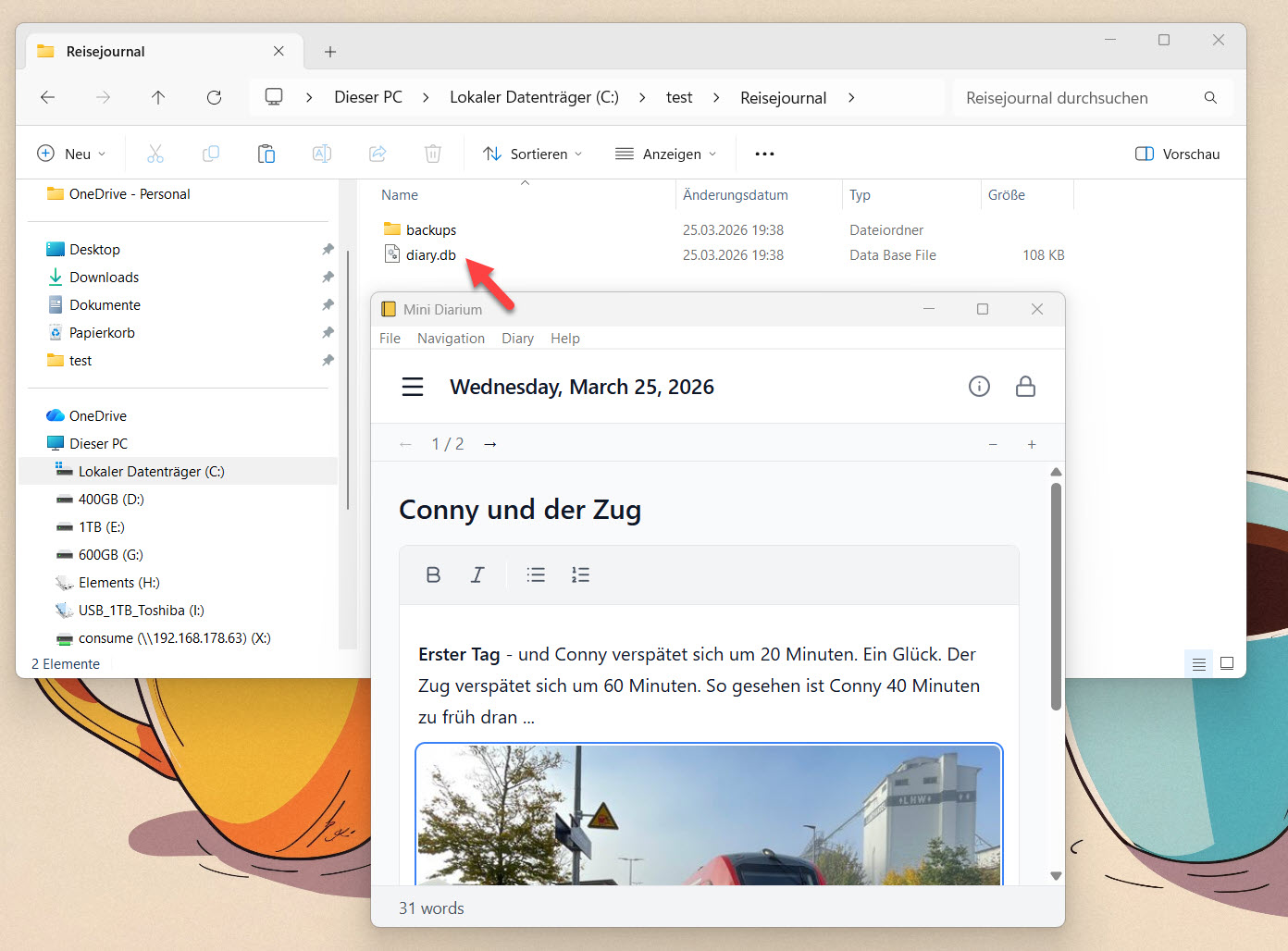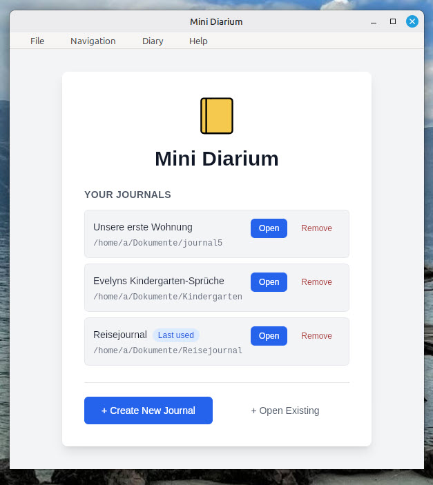 Da Mini Diarium sowohl unter Linux als auch unter MacOS und Windows funktioniert, kann so am gleichen Journal auf unterschiedlichen Systemen gearbeitet werden. Im Screenshot wurde die Datenbank von Linux Mint auf Windows übertragen: