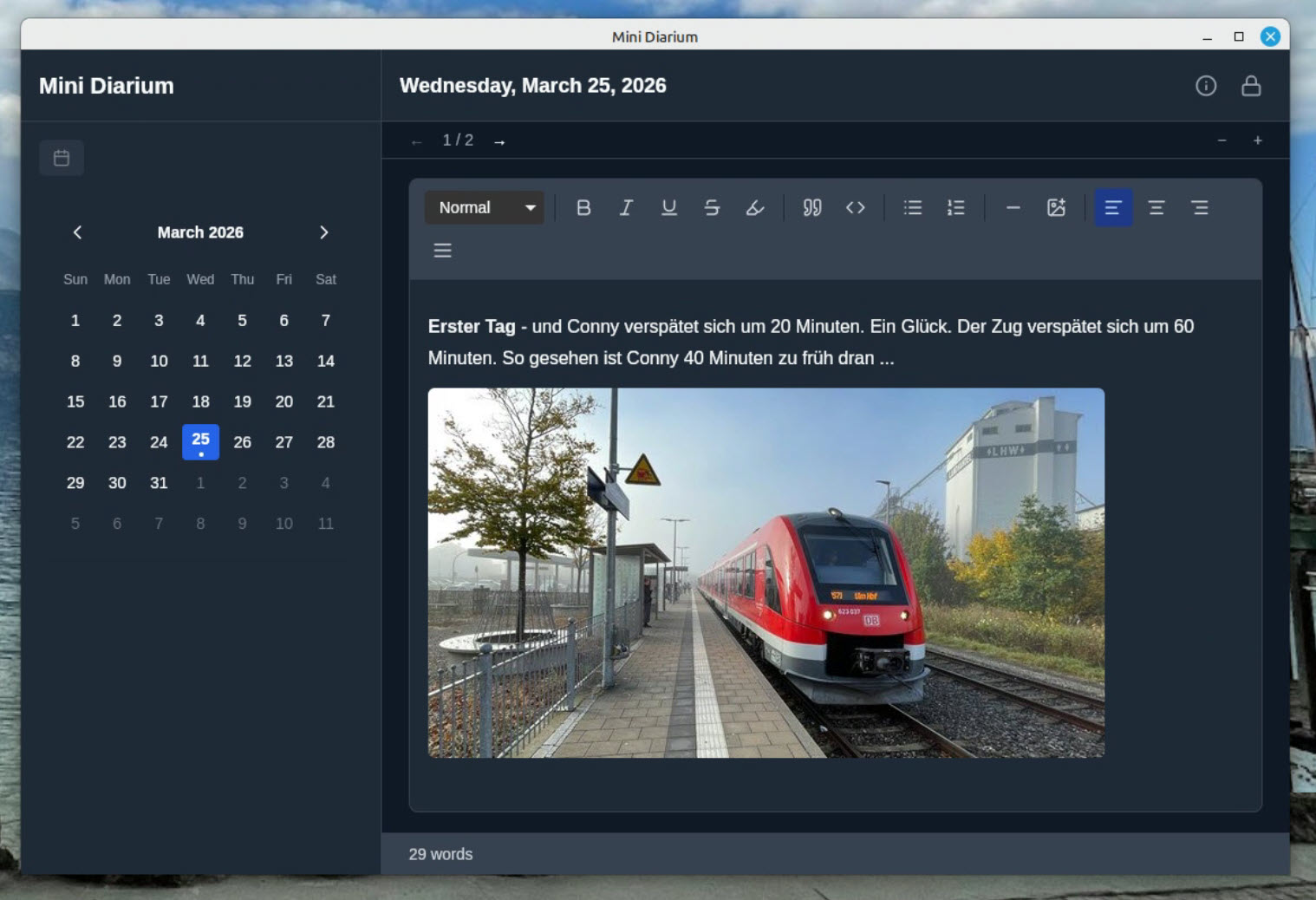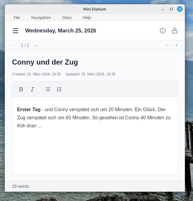 Reisenotizen, Labor-Fortschritte oder Erinnerungen an vergangene Tage - all dies und noch viel mehr kann man in einem Journal festhalten. So was kann man eigentlich mit beliebigen Anwendungen umsetzen, z. B. einem einfach Text-Editor oder Nextcloud-Notizen. Wenn es sich aber um persönliche Gedanken handelt, so möchte man den Inhalt der Notizen vor unbefugten Zugriffen schützen. Um diesen Punkt kümmert sich Mini Diarium. Die Homepage fasst die Absicht dahinter recht gut zusammen: "Mini Diarium is a private offline diary app for Windows, macOS, and Linux. AES-256-GCM encryption, local-first storage, no cloud, no telemetry."