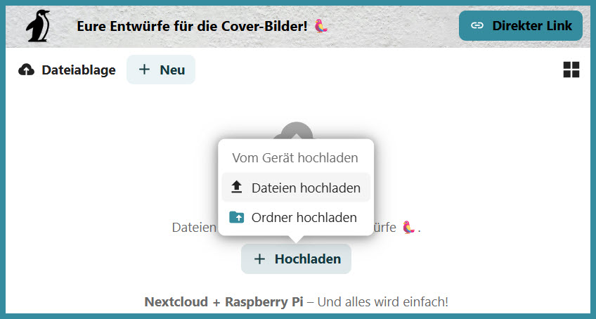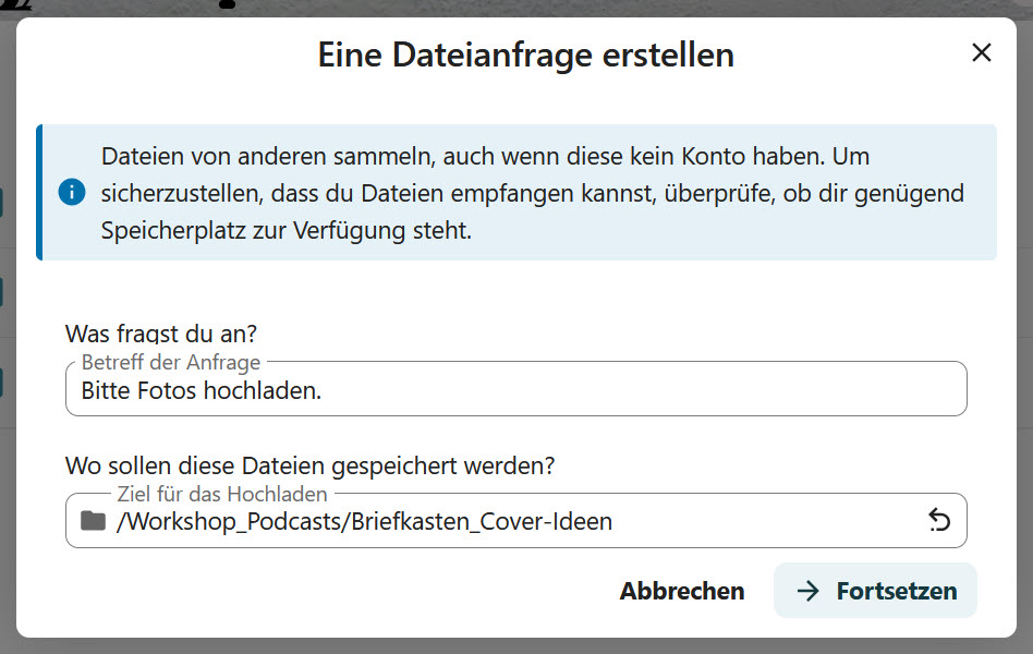 Das klappt auch mit den Browsern von mobilen Geräten und ist daher vielseitig einsetzbar: Nach einer Feier oder einem Urlaub kann man so die Fotos einsammeln, in einer Seminarsitzung oder bei einem Workshop die Produktionen der Teilnehmenden. In meinen Podcast-Seminaren gehen wir beispielsweise auf Kriterien der Cover-Gestaltung ein, die Teilnehmer:innen machen anschließend in kleinen Gruppen in der Umgebung Fotoaufnahmen und laden diese über einen solchen Link für die Seminarbesprechung hoch.