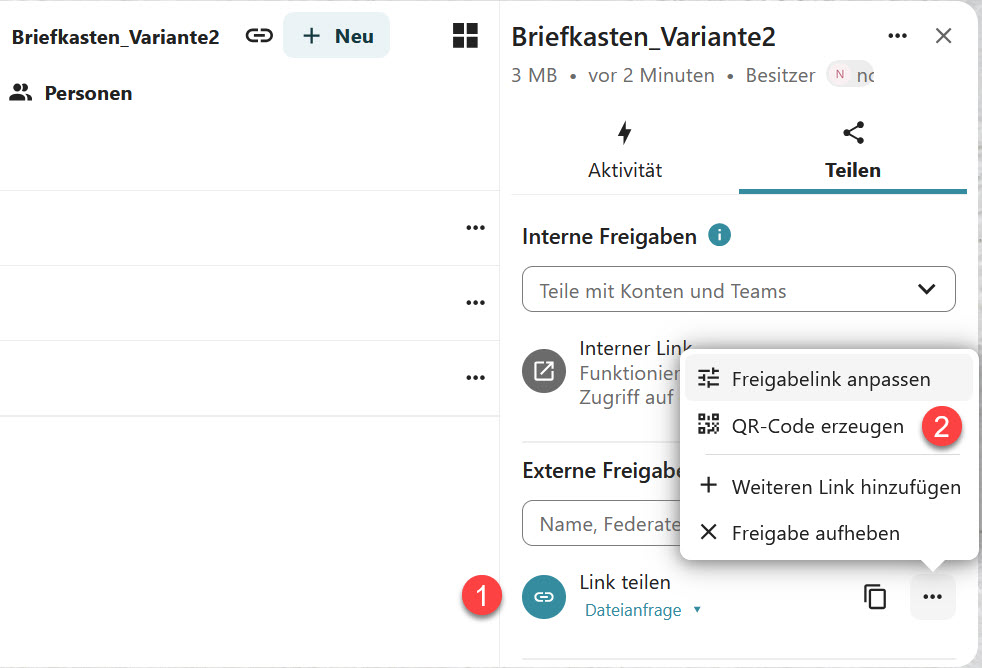 Wenn man nun aber die frühere Variante haben möchte? Alle Einreichungen sollen in einem Ordner landen, ohne dass Unterordner entstehen. Auch das ist möglich: Man geht dazu den "normalen" Weg der Ordnerfreigabe mit einem öffentlichen Link. Aber unter "Link teilen" (1) ändert man die Einstellung auf "Dateianfrage". Prinzipiell erhält man damit die gleiche Ansicht wie durch die vorhergehende Variante, doch diesmal wird kein Name abgefragt und es werden keine Unterordner angelegt. Kleiner Vorteil dieses Vorgehens: Wenn man dies im Rahmen einer Beamer-Präsentation durchführt, so kann man einen "großen" QR-Code mit dem Link einblenden (2).
