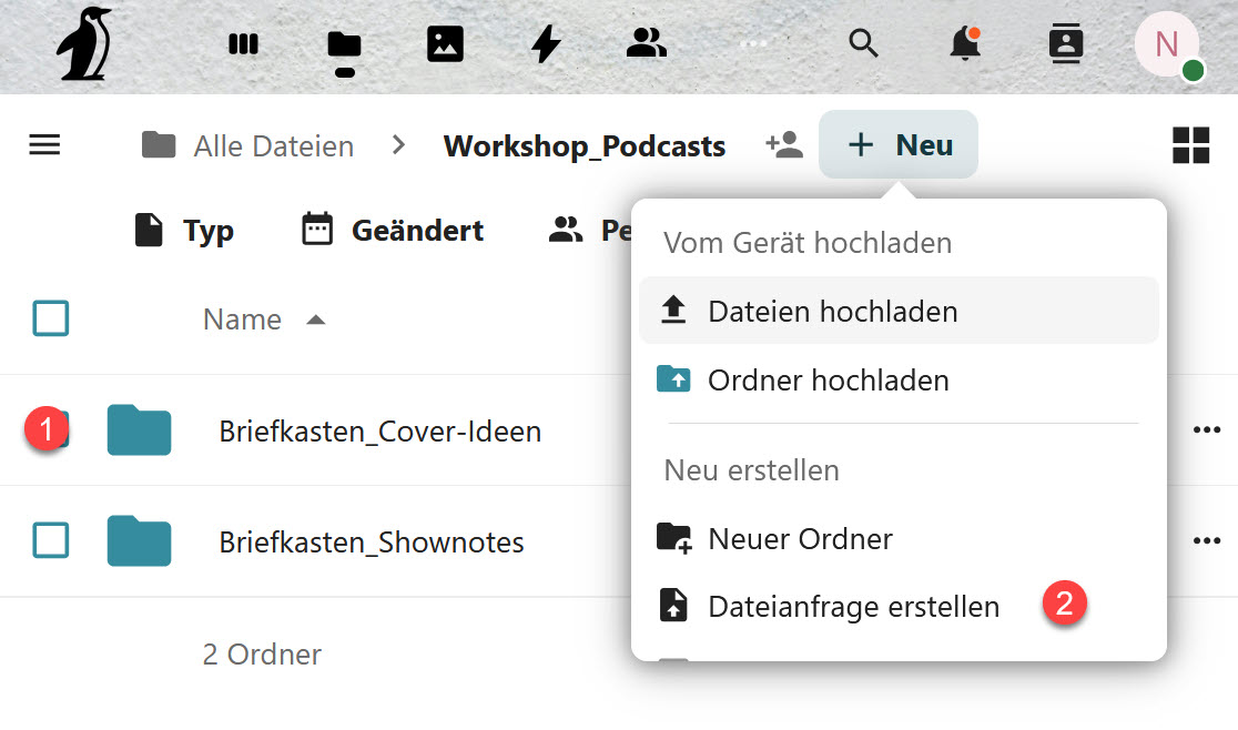 Zunächst legt man die gewünschten Sammelordner an (1). Der spätere Text auf der Uploadseite wird lauten: "Dateien hochladen nach [Ordnername]". Anschließend wählt man mit "+ Neu" den Menüpunkt "Dateianfrage erstellen" aus (2).