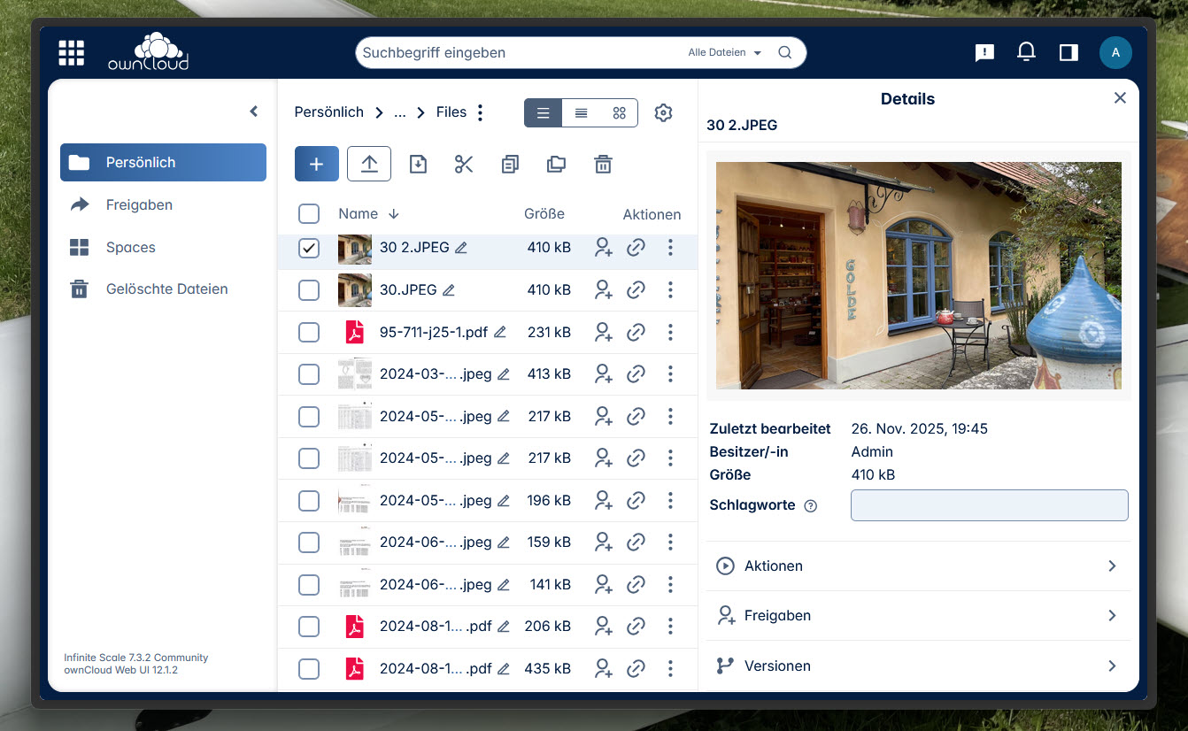 Auch dabei: Das Konzept "Spaces", das Dokumente (im Unterschied zur Nextcloud) nicht userzentriert, sondern projektzentriert verwaltet. Dazu lohnt sich bei Gelegenheit eventuell ein gesonderter Artikel.