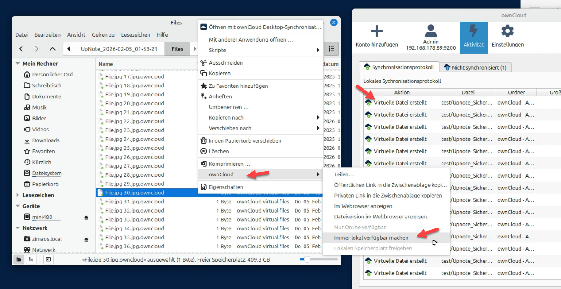 Den Desktop-Sync-Client gibt es für Linux, Windows und macOS. Schön ist, dass die Möglichkeit einer virtuellen Dateianzeige auch unter Linux vorhanden ist. Zwar nicht ganz so "hübsch" (mit Voransicht), wie man das unter den anderen Betriebssystemen kennt, aber es erfüllt seinen Zweck: Dateien werden erst dann lokal gespeichert, wenn man sie aufruft - ansonsten werden sie nur angezeigt und nehmen keinen Platz auf dem Gerätespeicher ein.