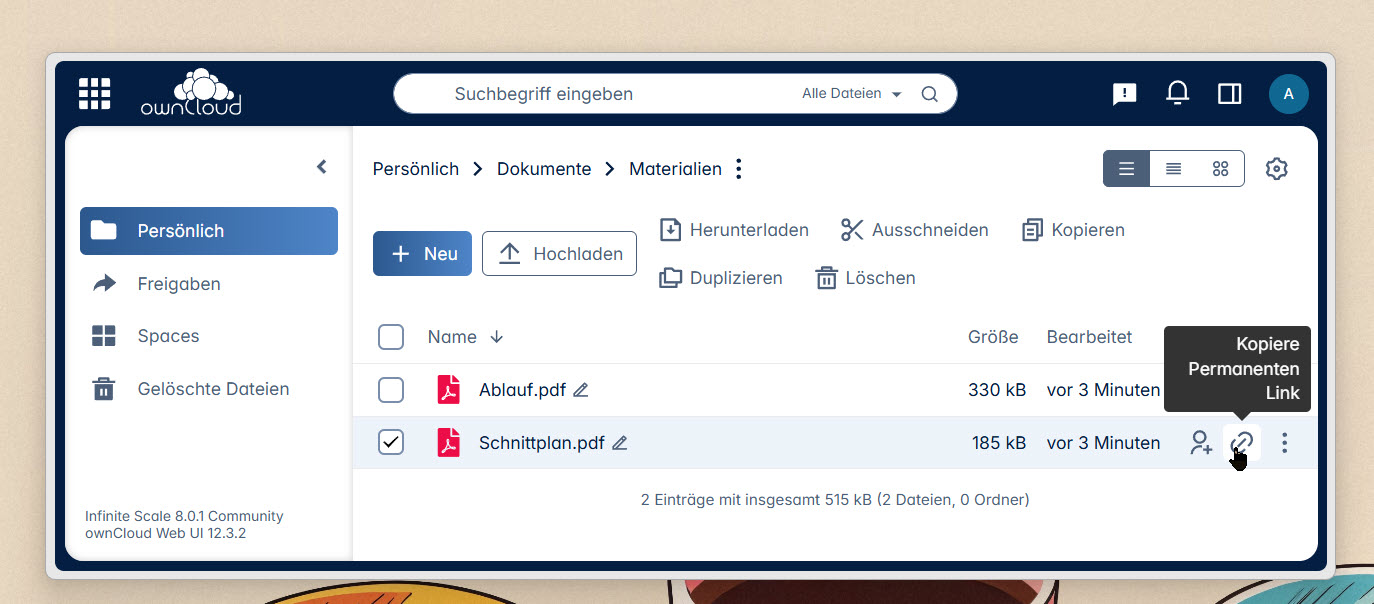 Die Bezeichnungen für dauerhafte Links sind je nach Anwendung unterschiedlich. Bei der Nextcloud nennen sie sich "interne Links", bei ownCloud/OpenCloud "permanente Links", bei Joplin "externe Links". Im Unterschied zu öffentlichen Freigabe-Links sind diese Verweise für die Nutzung innerhalb des eigenen Anwendungsumfelds gedacht.
