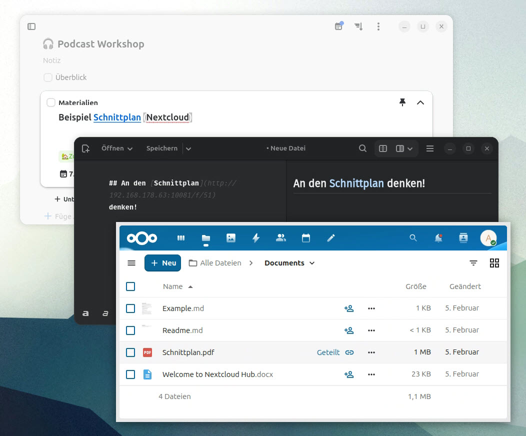 Damit hat man die Möglichkeit, z. B. in Aufgabenplanern, LibreOffice-Dokumenten, Markdown-Dateien usw. mit dem gleichen Link auf die gleiche Information zu verweisen: