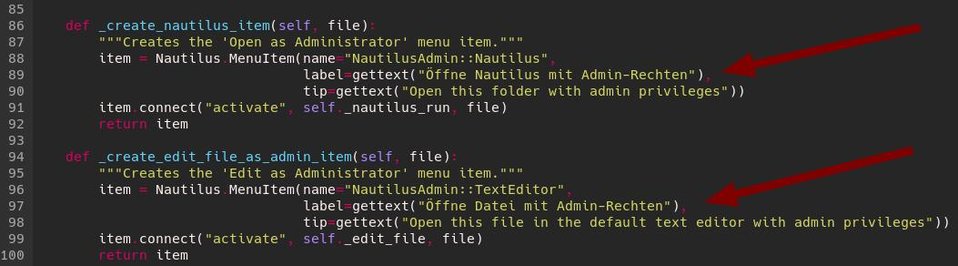 - Öffne diese Datei mit Root-Rechten mit einem beliebigen Editor: sudo micro nautilus-admin.py