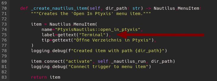 - Öffne diese Datei mit Root-Rechten mit einem beliebigen Editor: sudo micro nautilus-open-in-ptyxis.py