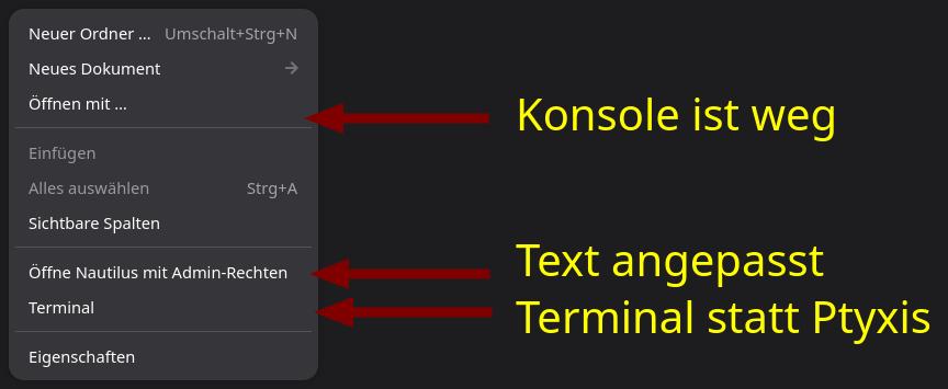 Ptyxis ist definitiv das bessere Terminal als gnome-console, sage ich. Um den Menüeintrag "In Konsole öffnen" aus dem Kontextmenü von Nautilus zu entfernen, muss man gnome-console deinstallieren. Wer das macht, bekommt von der Paketverwaltung (pamac) sogleich Abhängigkeitskonflikte um die Ohren gehauen. Das Paket hängt vom gnome-layout-switcher ab, der wiederum eine optionale Abhängigkeit von manjaro-help (oder so ähnlich) hat. Wer den gnome-layout-switcher nicht benötigt, muss die beiden Pakete (gnome-console und gnome-layout-switcher) entfernen. Da die Abhängigkeit von manjaro-help nur optional ist, erhält man zwar eine Warnung, kann die oben genannte Deinstallation dennoch durchführen. Danach könnt ihr euch ab-/anmelden und seht dann, dass "In Konsole öffnen" aus dem Menü verschwunden ist.