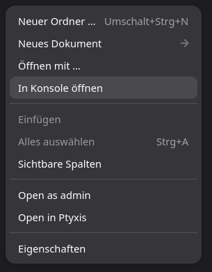 - Open in Ptyxis (das ist der Eintrag, den nautilus-open-in-ptyxis bewirkt hat)