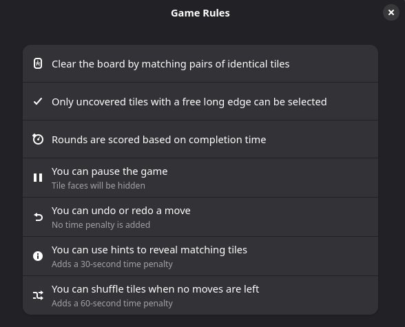 Das war mir bisher nicht bewusst. Ich kenne Mahjongg nur in der Variante für Einzelspieler, die gegen die Zeit antreten. Dieses Spiel wird als Mahjongg-Solitaire bezeichnet, in Anlehnung an das Patience-Kartenspiel. Jedoch gibt es Implementierungen der umfangreichen Spielregeln für vier Spielende, z. B. das Spiel Kajongg auf der KDE-Plattform. Sucht man im App-Store der eigenen Distribution, findet man viele Ergebnisse für Mahjongg-artige Spiele. In diesem Artikel möchte ich die Einzelspielerversion vorstellen, die von mat für GNOME 49 überarbeitet wurde.
