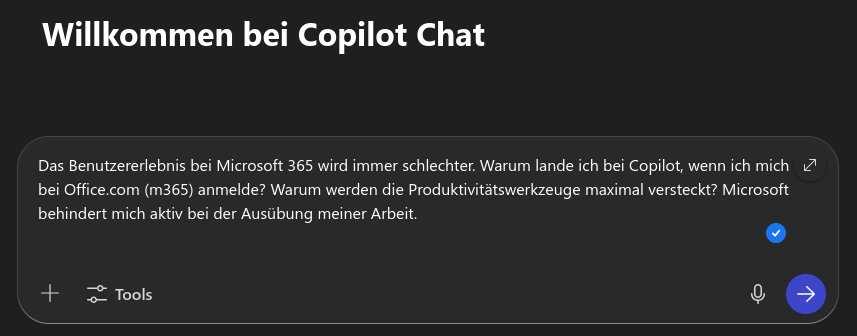 Ich kann es mir nicht verkneifen, aber ein wenig "ranten" in diesem Kontext, gehört doch dazu. Als ich den ersten Absatz dieser Serienfolge geschrieben habe, musste ich über den Webbrowser auf meinen Firmen-Account zugreifen (office.com). Früher ging es noch so einigermassen, aber mittlerweile ist die Benutzererfahrung bei Microsoft nicht mehr zu unterbieten. Nach der Anmeldung landet man auf einer übersichtlichen Seite, die den direkten Zugriff auf die wesentlichen Produktivitätsanwendungen erlaubt. Von wegen – man landet in der KI-Hölle:
