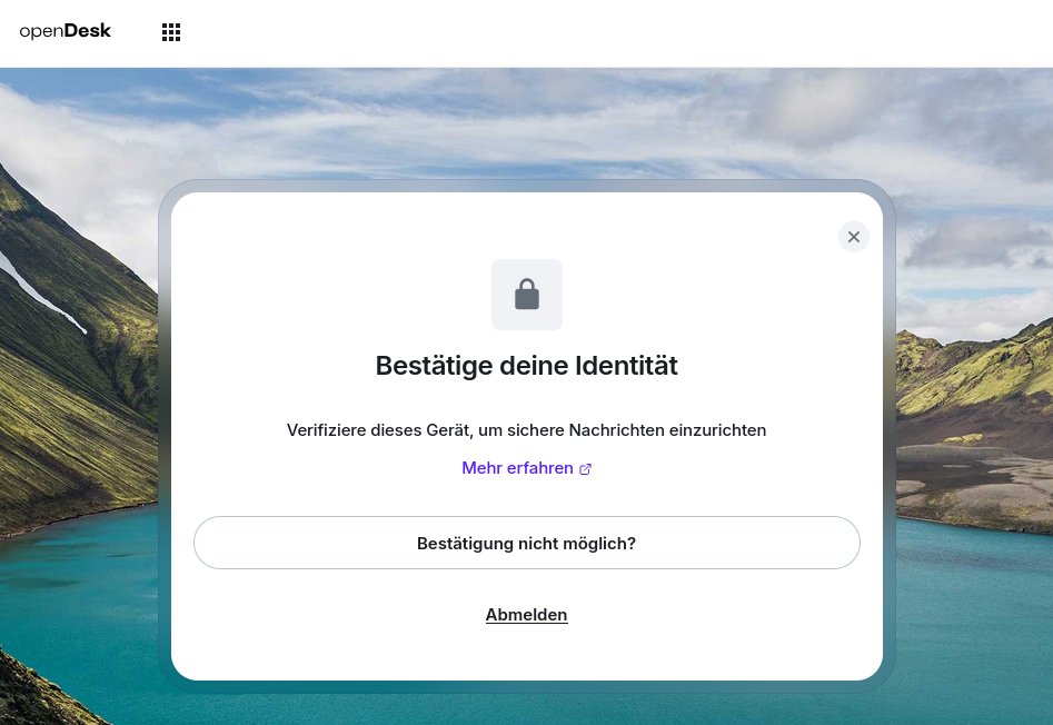 An dieser Stelle komme ich nicht weiter, wie ihr aufgrund der Bildschirmaufnahme erahnen könnt. Ach was, natürlich komme ich weiter. Nach dem Klick auf "Bestätigung nicht möglich", hangelt man sich durch drei weitere Dialoge und landet dann im Matrix-Client von openDesk.
