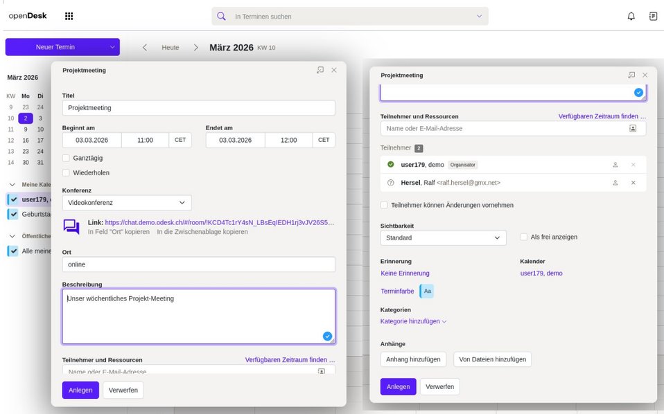 Zuerst habe ich mich selbst als Person in der Kontakt-Anwendung erzeugt. Da ich in openDesk als "demo user179" unterwegs bin, bin ich selbst eine andere Person in dieser Demonstration. Dann habe ich in der Kalender-Anwendung einen neuen Termin erstellt: