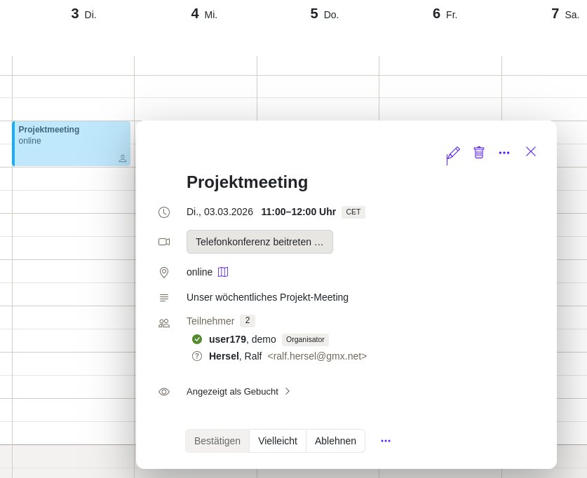 Der Dialog zum Erzeugen eines Termins besteht nur aus einem Fenster. Damit ihr alle Felder sehen könnt, habe ich den oberen und unteren Teil des Dialogs nebeneinandergelegt. Hier sind zwei Sachen interessant: Man kann dem Termin eine Videokonferenz hinzufügen und ich kann mich aus den Kontakten zum Termin einladen. Nach dem Speichern des Termins sieht er so aus: