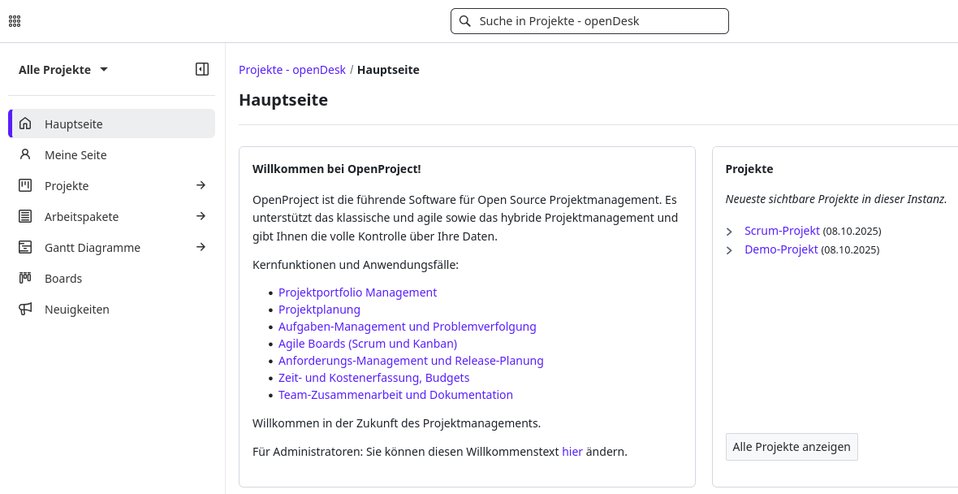 Nach dem Klick auf "Projekte" im openDesk-Portal startet die Anwendung OpenProject in einem eigenen Tab, wie wir das bereits von den anderen Anwendungen gewohnt sind. Wir werden von der Hauptseite begrüsst, die viele Informationen zur Einführung bereitstellt.