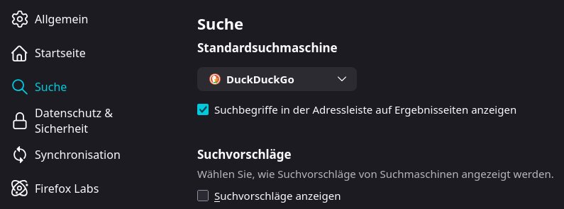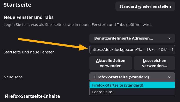 Das führt dazu, dass ich beim Starten von Firefox und bei jedem neuen Tab, entweder im URL-Feld oder im Suchfeld mit DuckDuckGo suche.