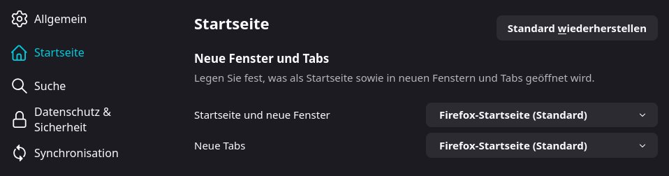 Als Startseite habe ich für beide Fälle die Firefox-Startseite belassen.