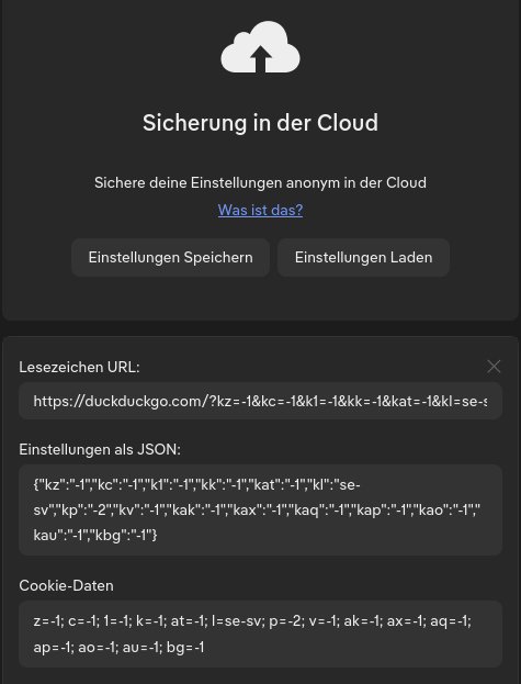 Ich zeige dazu keine Bildschirmaufnahmen, weil die Optionen sehr umfangreich sind. Dort kann man die Suche nach eigenem Gusto konfigurieren. Und jetzt komme ich zur Stelle, an der der Hund in die Pfanne springt. Wie speichert man die eigenen Einstellungen ab? Der Einstellungs-Dialog von DuckDuckGo bietet dafür mehrere Optionen: