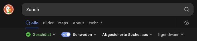 Okay, die KI-Dienste sind ausgeschaltet und auch die "Abgesicherte Suche" stimmt. Aber Schweden? Niemand hat "Schweden" eingestellt. DuckDuckGo ist ein US-Dienst. Hat dort jemand "Sweden" mit "Switzerland" verwechselt? Diesen Versuch kann man beliebig oft wiederholen; irgendwas ist immer falsch. Das Speichern in der Duck-Cloud habe ich ebenfalls versucht; geht auch nicht.