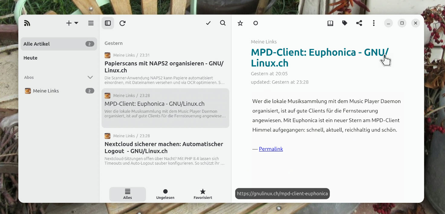 In diesem Beispiel wurde als Filter eingesetzt: Suchwort "GNU" (1) UND Tag "Linux" (2). Hinter dem Feed-Symbol (3) verbirgt sich der entsprechende Link, der in einen beliebigen Feedreader eingesetzt werden kann (hier: Newsflash):