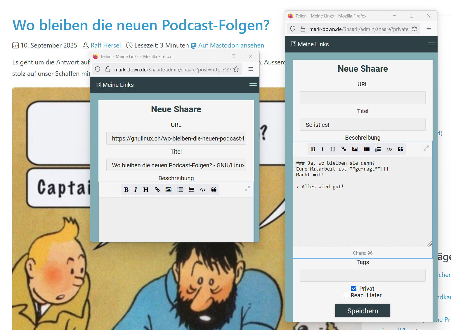 Hm, in der Vorschau funktionierten die Markdown-Links, wie [Shaarlier](https://f-droid.org/de/packages/com.dimtion.shaarlier/ "Shaarlier"), einwandfrei. Jetzt noch mal ohne den Tooltip-Text in Anführungszeichen: Shaarlier