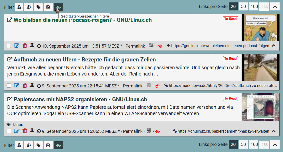 Was es so an Plugins gibt, wird auf https://shaarli.readthedocs.io/en/master/Plugins.html#usage beschrieben. Allerdings sehe ich gerade, dass gototop in der Liste fehlt. Das gibt's unter https://github.com/alexisju/gototop. Dort fehlen aber noch die letzten kleinen Anpassungen, die ich auf https://github.com/alexisju/gototop/issues/4 erwähne. Müsste ich mal bei Gelegenheit fertigmachen …