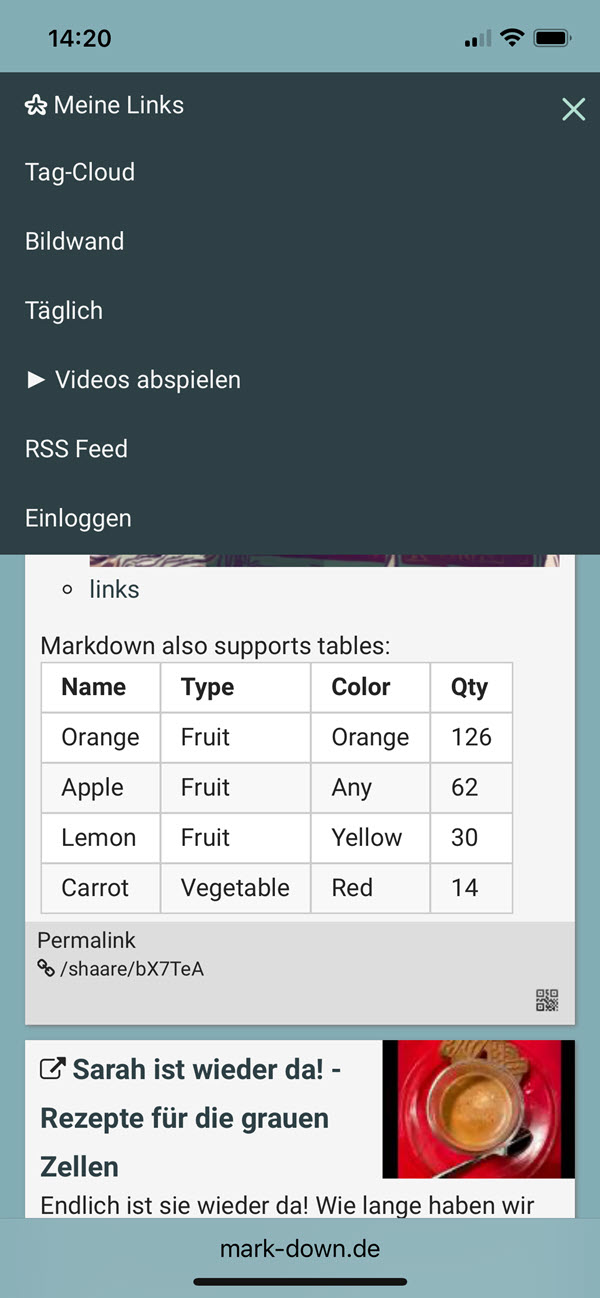 Die Beschreibungsangaben zu einem Lesezeichen können mit Markdown verfasst werden. Eine Besonderheit ist die Notizfunktion: Enthält ein Beitrag keinen Link, so wird der Text als Notiz dargestellt. Man kann das als kleines Notizsystem für sich selbst nutzen (Beitrag dann mit "privat" kennzeichnen) - oder in den Feeds freigeben bzw. in der eben erwähnten Zeitungsdarstellung.