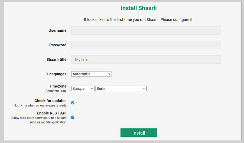 Shaarli ist hingegen völlig anspruchslos - jeder einfache Homepage-Server genügt, denn PHP reicht. Noch nicht einmal eine zusätzliche Datenbank wie MySQL usw. wird benötigt. Die Dateien aus dem ZIP-Archiv einfach auf den Server in ein Unterverzeichnis schieben und dieses im Browser aufrufen. Es erscheint eine kleine Eingabemaske, mit man sich den Account anlegt - Button "Install" klicken - eine Sekunde später läuft Shaarli.