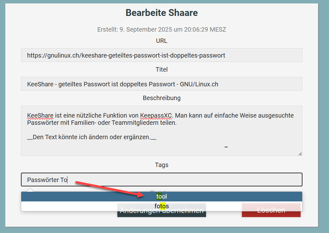 Bilder und Textzeilen werden automatisch von der Originalseite abgerufen. Allerdings stellt nicht jede Seite alle Metadaten zur Verfügung. In einem einfachen Editor kann man selbst entsprechende Texte ergänzen oder ändern. Sofern Tags bereits vorhanden sind, wird eine Vorschlagliste angezeigt.