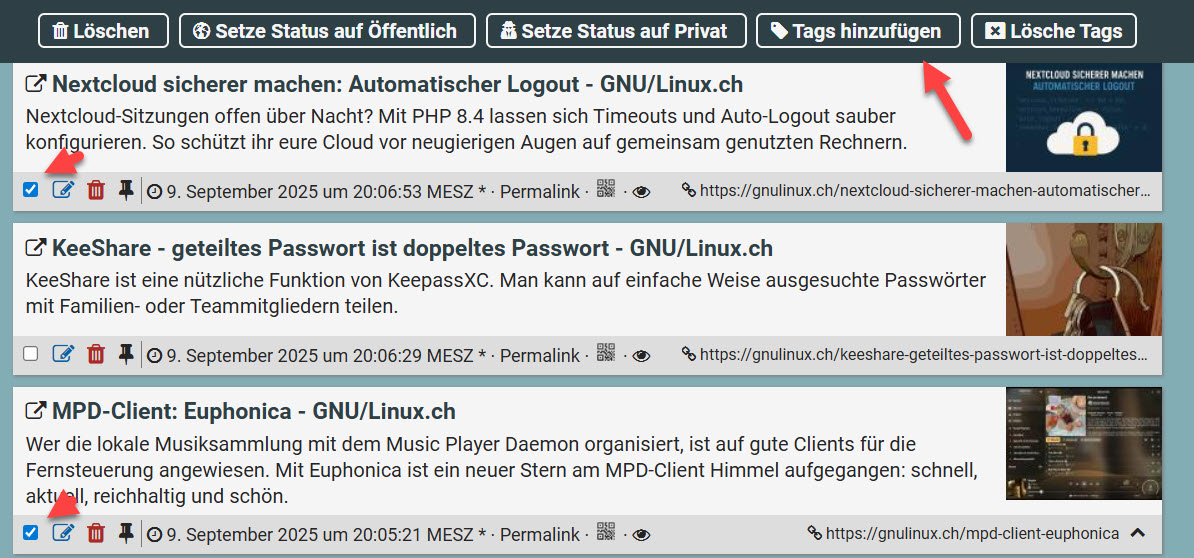 Schlagwörter können bei der Aufnahme eines neuen Links eingegeben werden. Aber auch nachträglich ist das durch die Bulk-Funktion kein Problem: Man kreuzt die betreffenden Bookmarks an und weist ihnen in einem Rutsch die gewünschten Tags zu.