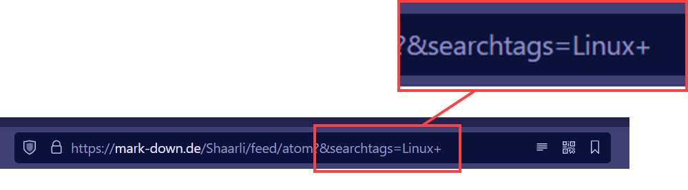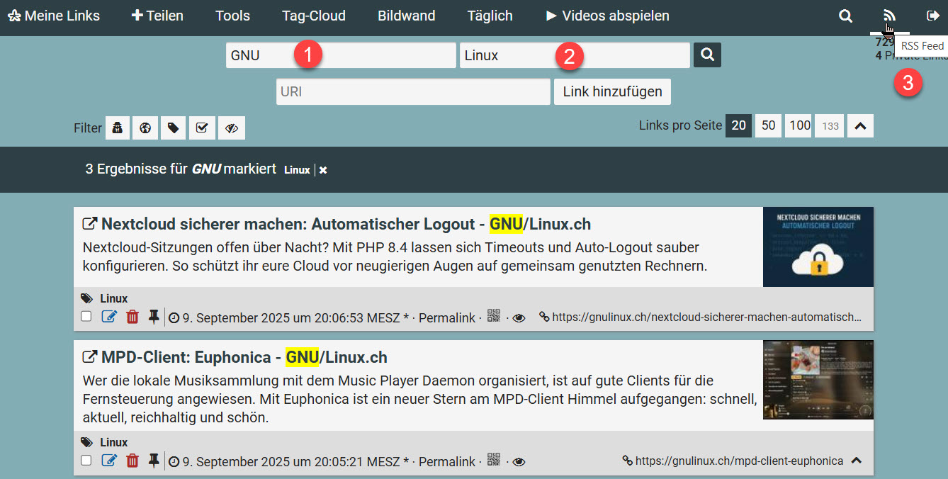 Möchte man nun beispielsweise für einen Workshop den Teilnehmer:innen eine Linkliste zum Thema "Linux" zur Verfügung stellen, so generiert Shaarli einen Feed-Link mit diesem Suchtag: