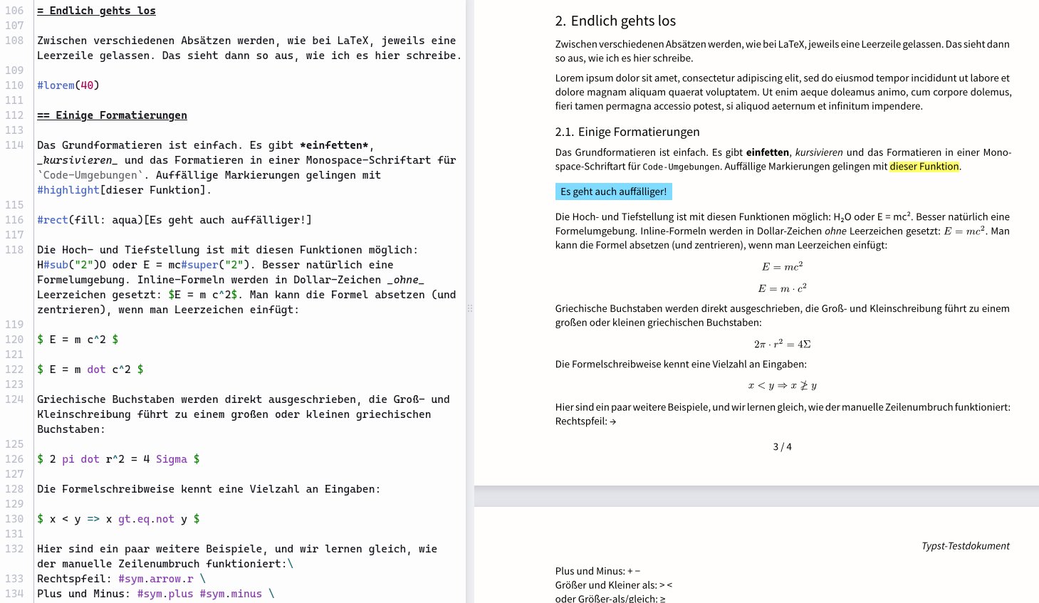 Die genannten Anwendungen könnt ihr gerne selbst ausprobieren; ich beschreibe hier nur die Verwendung des Typst-Compilers. Die Installation erfolgt über die Paketverwaltung eurer Distribution in gewohnter Weise. Um den Typst-Code zu schreiben, verwendet ihr einen Texteditor oder eine IDE eurer Wahl. Dann kompiliert ihr den Code und erhaltet ein PDF-Dokument. Im Vergleich zu den Anwendungen mit Vorschau, ist das etwas nervig. Egal, hier ist ein konkretes Beispiel: