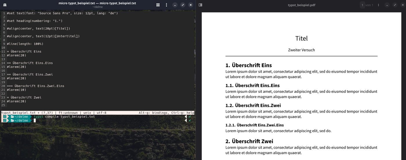 Ich habe links ein Terminal geöffnet und den Editor Micro gestartet. Darin seht ihr oben den Typst-Code. Dann habe ich in einem Micro-Split-Screen ein Terminal gestartet, um den Typst-Compiler aufzurufen. Auf der rechten Seite seht ihr den PDF-Betrachter mit dem kompilierten Typst-Dokument. Der Workflow geht so: