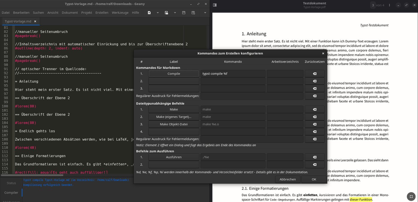 Links seht ihr den Code-Editor von Geany. Darunter ist die Compiler-Ausgabe eingeblendet. Um den Code mit Typst zu kompilieren, öffnet ihr den Menüpunkt: "Erstellen, Kommandos zum Erstellen konfigurieren". Dort macht ihr den Eintrag, wie er im Screenshot zu sehen ist: "Compile, typst compile %f". Nun könnt ihr den Code schreiben, auf F8 drücken, im Compile-Fenster (links unten) evtl. Fehlermeldungen sehen und rechts im PDF-Viewer das Ergebnis bewundern. Der PDF-Viewer aktualisiert die generierte PDF-Datei automatisch. Viel bequemer geht es nicht.
