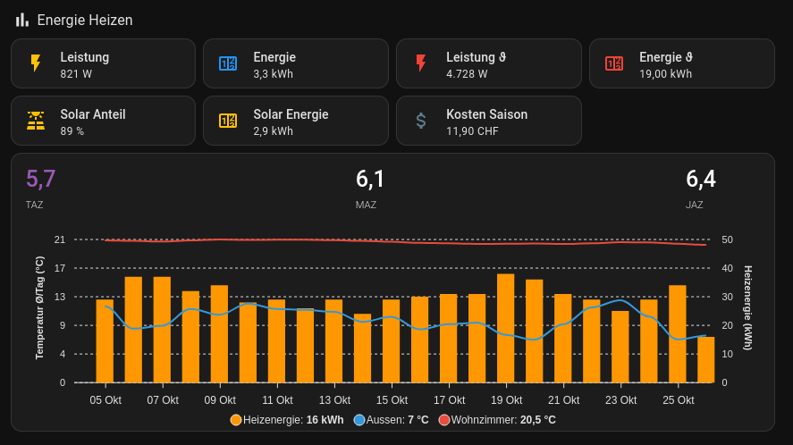 Über 49 Tage ergibt das im Mittel rund 4.1 kWh elektrische Energie pro Tag und etwa 28.7 kWh thermische Energie. Im direkten Kostenvergleich ergibt sich eine Einsparung von rund 90 % gegenüber Gas in dieser Periode. Der hohe PV-Anteil zeigt, dass die Regelung den Eigenverbrauch wirksam steigert.