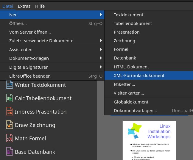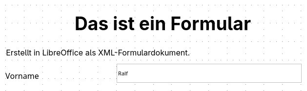 Dann gibt es das OASIS Open Document Format for Office Applications (OpenDocument, ODF), welches ein international genormter quelloffener Standard für Dateiformate von Bürodokumenten wie Texten, Tabellendokumenten, Präsentationen, Zeichnungen, Bildern und Diagrammen ist. Wenige wissen, dass es beim Open Document Format den Untertyp XML-Formulardokument gibt. Zum Beispiel in LibreOffice kann man ein Formular in diesem Format erstellen und mit allen Anwendungen öffnen und bearbeiten, die das ODF-Format unterstützen (LibreOffice, ONLYOFFICE, Microsoft Office, usw.). Hierzu gibt es einen Artikel von uns.