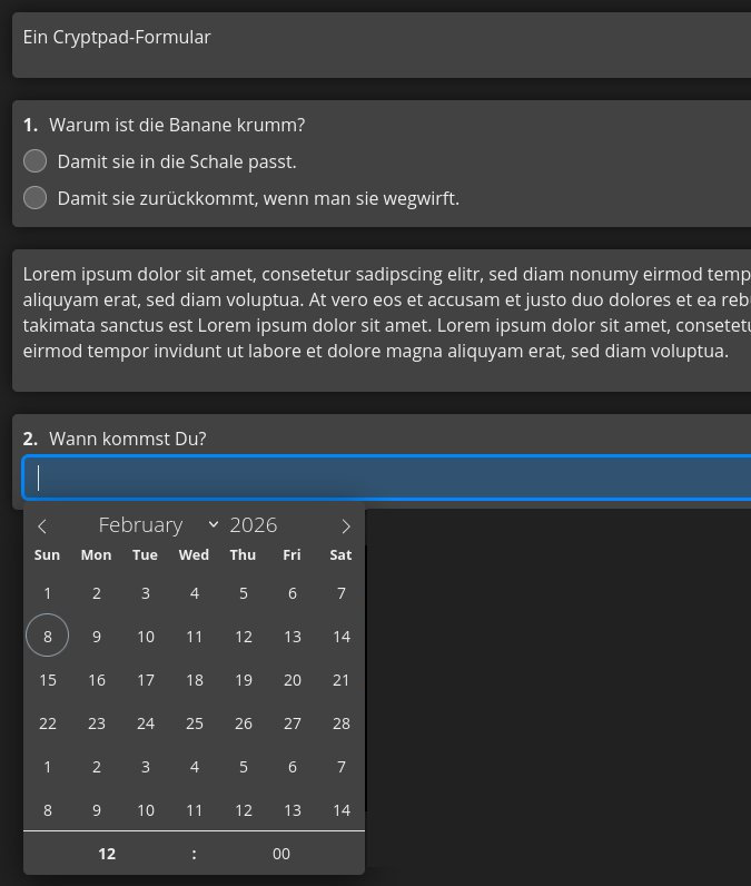 Was hier fehlt, ist die Möglichkeit, Freitext einzugeben und zu formatieren. Das mag euch als Nebensache erscheinen, zeigt jedoch einen wichtigen Unterschied zwischen Formular und Umfrage auf. Mit dem CryptPad-Formular kann man (mit Einschränkungen) ein richtiges Formular erstellen, weil es nicht nur Abfrageelemente gibt und weil (in Grenzen) Markdown-Formatierung möglich ist. Nextcloud-Forms beschränkt sich nur auf Fragen und erlaubt keine Formatierung.
