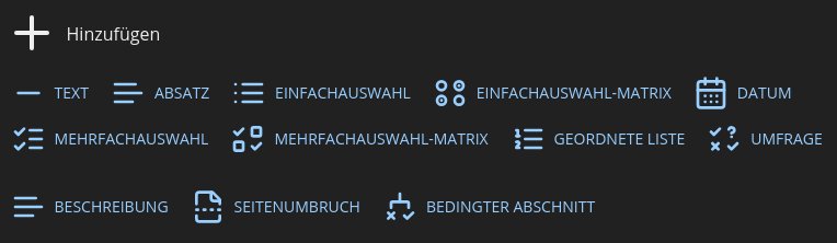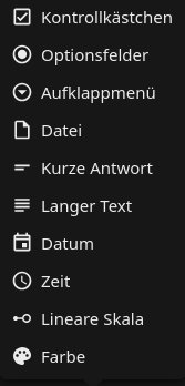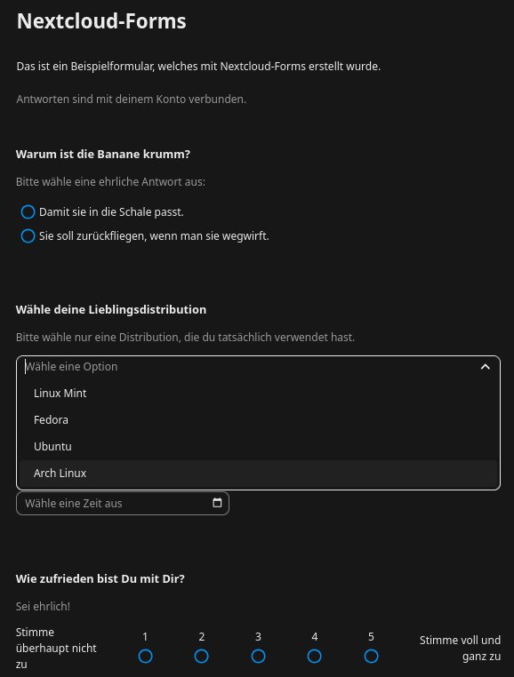 Das Nextcloud-Plugin heisst Nextcloud-Forms und erfüllt viele der oben genannten Anforderungen. Die Auswahl an Formularelementen entspricht in etwa dem, was wir vorhin bei CryptPad gesehen haben: