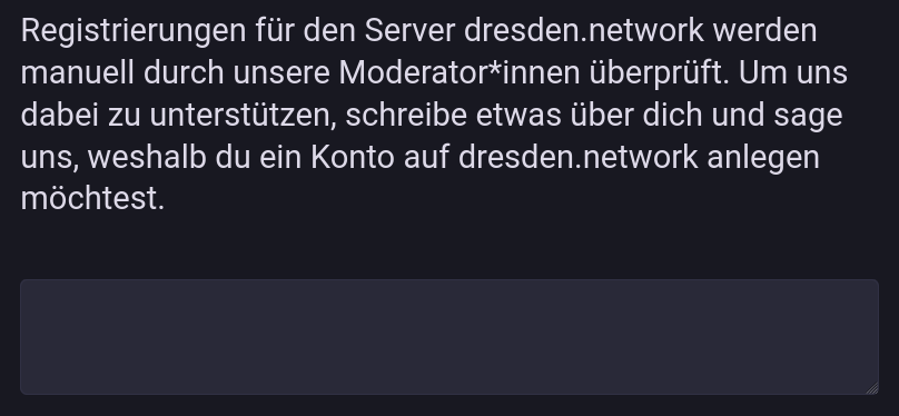 Screenshot von einem Teil des Anmeldeprozesses bei dem Mastodon-Server dresden.network. Zu lesen ist: Registrierungen für den Server dresden.network werden manuell durch unsere Moderator*innen überprüft. Um uns dabei zu unterstützen, schreibe etwas über dich und sage uns, weshalb du ein Konto auf dresden.network anlegen möchtest.