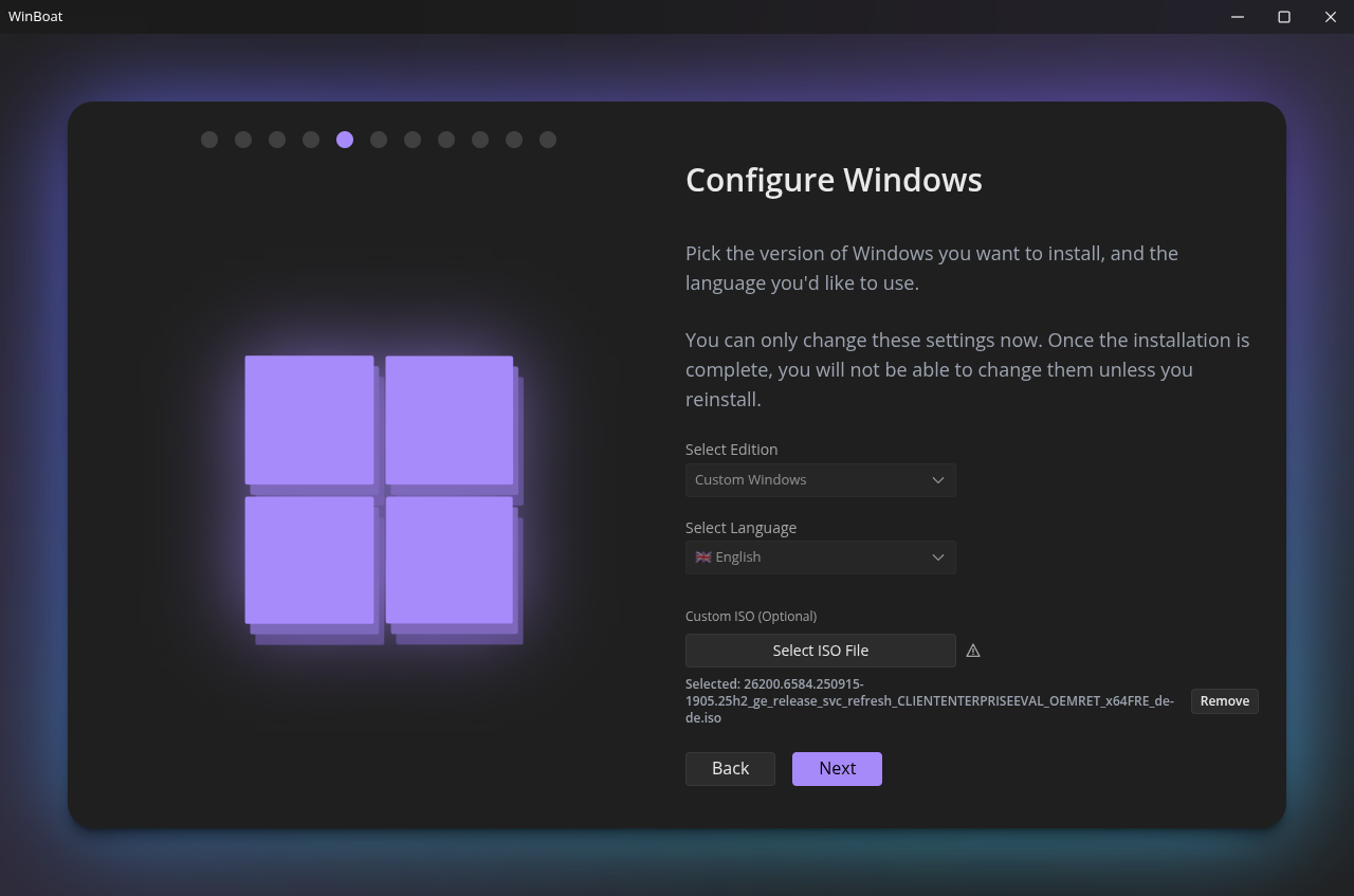 Man kann das Windows (ab Version 10) herunterladen oder selbst ein ISO bereitstellen. Laut System wird die Installation eines Windows auf Deutsch nicht empfohlen, ich hatte bei der deutschsprachigen ISO jedoch keine Probleme.